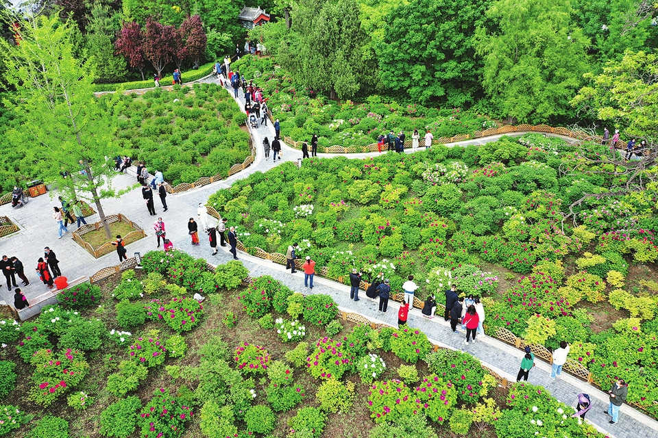 近日,太原迎澤公園牡丹園內(nèi),200多個(gè)品種、3000余株牡丹競(jìng)相盛放,吸引了不少游客前來觀賞,呈現(xiàn)出人與自然和諧相融的綠色生態(tài)畫卷。圖為5月6日,從空中鳥瞰太原迎澤公園牡丹園。(記者李兆民攝)