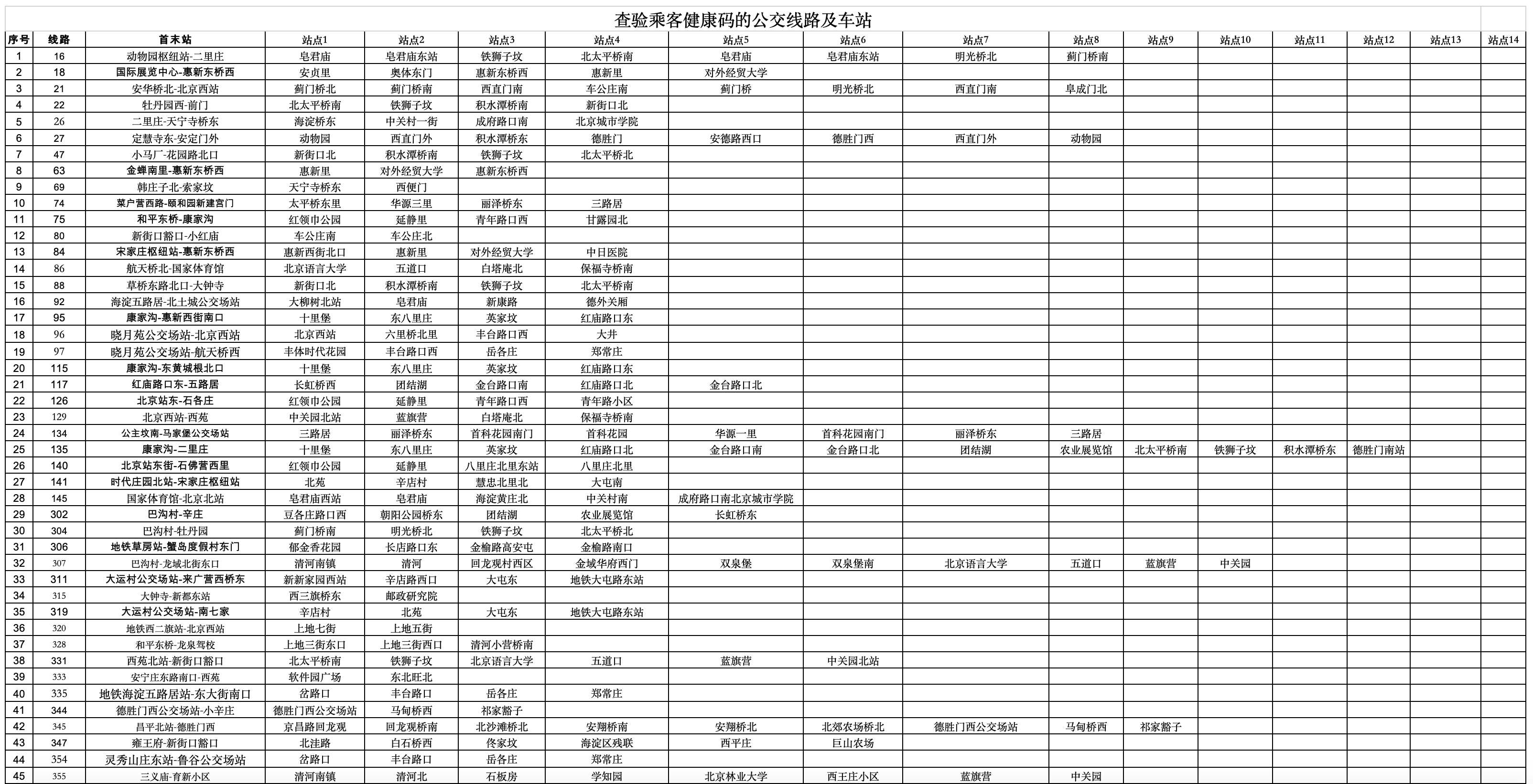 人民網(wǎng)北京5月16日電 (池夢(mèng)蕊)根據(jù)北京市疫情防控需要,為做好精細(xì)精準(zhǔn)防控,自2022年5月17日首班車起,北京市疫情防控封控區(qū)、管控區(qū)周邊的190條地面公交線路重點(diǎn)車站和54座地鐵車站(具體見附表),查驗(yàn)乘客健康碼上車。后續(xù)將結(jié)合北京市疫情防控措施進(jìn)行動(dòng)態(tài)更新。