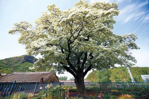 本報(bào)訊(記者 王可心)日前,密云區(qū)新城子鎮(zhèn)蘇家峪村一株古流蘇樹進(jìn)入盛花期,作為北京市屈指可數(shù)的古流蘇樹,不僅因花枝觀賞性強(qiáng)受到民眾喜愛,更因其歷史價(jià)值而被廣泛關(guān)注。據(jù)了解,流蘇樹系北京市二級保護(hù)野生植物?!拔覀兇暹@株流蘇樹是一級古樹,據(jù)專家推斷,至今已有近600年歷史?!碧K家峪村黨支部書記王銀江介紹,該樹高約13米,主干到1.3米處分為兩主枝,向上延展成蘑菇形樹冠,平均冠幅約16米?;ㄆ陂_滿潔白的流蘇花,遠(yuǎn)觀如覆霜蓋雪,流蘇細(xì)穗隨風(fēng)搖曳,清香怡人。供圖/密云區(qū)委宣傳部