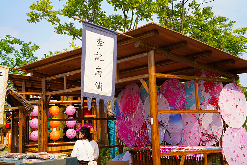 看罷演出,沿湖邊向東而行,是新近完善的“宋朝集市”。“虎頭鞋”“界首彩陶”“油紙傘”“古法燒制酒”等應(yīng)有盡有,“小販們”則身著古裝,起勁吆喝,兜攬生意,再現(xiàn)當(dāng)年宋朝集市的盛況。