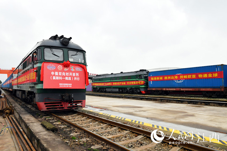 2月19日,2022年江西省首列中俄雙向對開班列(南昌—莫斯科)在南昌向塘國際陸港成功到發(fā)?!皩﹂_班列”的開行將大大提高集裝箱周轉效率,降低企業(yè)運輸成本。 人民網 時雨攝