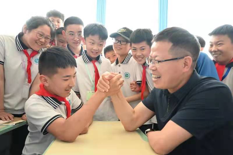 人民網(wǎng)莒縣5月26日電 5月26日上午,山東莒縣博雅實驗學校校長張迪洲(右)在課間同學生們一起玩掰手腕游戲,孩子們笑的很開心。