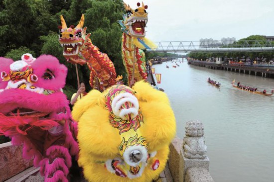 自2018年以來,每年的端午節(jié),嘉興桐鄉(xiāng)都在崇福鎮(zhèn)舉辦端午民俗風(fēng)情活動,這已是第五屆?;顒臃譃椤懊袼渍寡荨薄岸宋缑袼仔恪薄八雾嶏L(fēng)情展”“宋韻文創(chuàng)美食集”四大主題,包括運(yùn)河鼓舞、龍獅、大纛旗表演、“年年有魚”魚燈表演、“風(fēng)雅桐鄉(xiāng)十二樂章”龍舟競渡、“舌尖上的端午”美食雅集等15項(xiàng)活動,從早上9時30分啟動,一直延續(xù)到晚上8時。