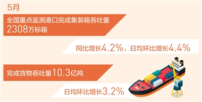 本報北京6月3日電 (記者劉志強(qiáng))記者從交通運(yùn)輸部獲悉:5月,全國重點(diǎn)監(jiān)測港口完成集裝箱吞吐量2308萬標(biāo)箱,同比增長4.2%,日均環(huán)比增長4.4%,完成貨物吞吐量10.3億噸,日均環(huán)比增長3.2%,水運(yùn)業(yè)生產(chǎn)穩(wěn)中向好。