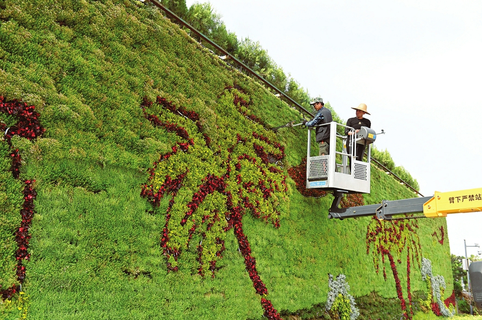 6月9日,太原植物園內(nèi),園藝師在一面布滿綠植的墻面上修剪出一幅美麗的畫卷。太原植物園開放以來,以優(yōu)美的原生態(tài)綠色景觀吸引了大批游客,成為省城綠色生態(tài)“打卡地”。(記者阮洋攝)