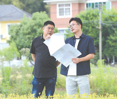 浙江省杭州市臨安區(qū)天目山鎮(zhèn)駐鎮(zhèn)規(guī)劃師金宇航(右)在現(xiàn)場踏勘。