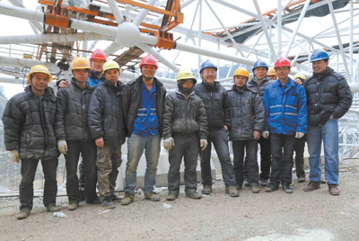 “中國天眼”索網(wǎng)合攏時,南仁東(左七)、姜鵬(右一)與現(xiàn)場施工人員一起合影留念。