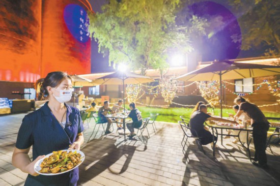 在廠東門(mén)廣場(chǎng)附近,人氣餐廳首鋼大食堂背后的巨大筒倉(cāng)被紅色燈光照亮。董先生一家掃碼測(cè)溫后直接落座戶(hù)外用餐區(qū),點(diǎn)了烤串和麻辣小龍蝦,孩子還特意點(diǎn)了瓶首鋼汽水。“在這些鋼鐵大家伙的圍繞中擼串兒,全北京就這一家!”董先生說(shuō)。