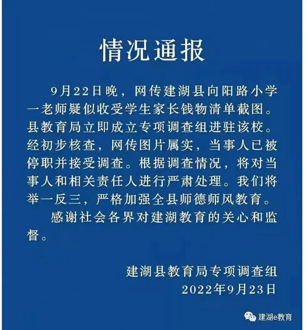 網(wǎng)傳鹽城建湖一老師收受學(xué)生家長(zhǎng)錢物 官方回應(yīng):當(dāng)事人已被停職