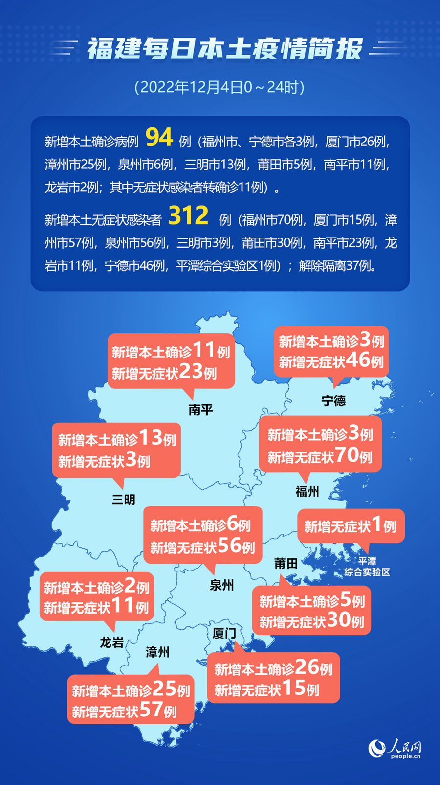 人民網(wǎng)福州12月5日電 (易雪妍、陳永整)據(jù)福建省衛(wèi)健委網(wǎng)站消息,12月4日0~24時(shí),福建省報(bào)告新增本土確診病例94例(福州市、寧德市各3例,廈門(mén)市26例,漳州市25例,泉州市6例,三明市13例,莆田市5例,南平市11例,龍巖市2例;其中無(wú)癥狀感染者轉(zhuǎn)確診11例)。當(dāng)日?qǐng)?bào)告新增本土無(wú)癥狀感染者312例(福州市70例,廈門(mén)市15例,漳州市57例,泉州市56例,三明市3例,莆田市30例,南平市23例,龍巖市11例,寧德市46例,平潭綜合實(shí)驗(yàn)區(qū)1例);解除隔離37例。