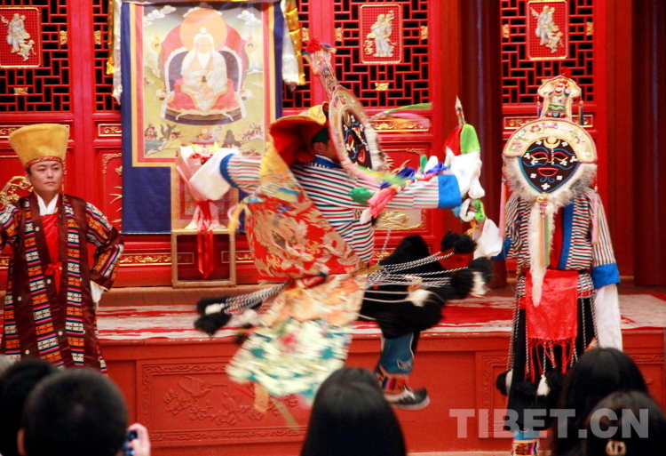 圖為拉薩市城關(guān)區(qū)娘熱民間藝術(shù)團(tuán)演員多吉次仁表演國家級非物質(zhì)文化遺產(chǎn)“嘎爾”攝影:劉莉