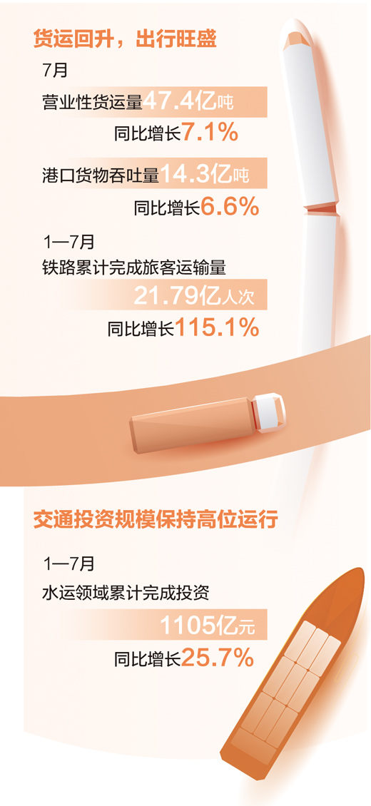 貨運回升,出行旺盛,折射出交通運輸行業(yè)向好、活力更足的態(tài)勢。“總體看,7月份交通運輸經(jīng)濟繼續(xù)保持恢復(fù)態(tài)勢,主要指標同比均實現(xiàn)增長?!苯煌ㄟ\輸部政研室副主任孫文劍說。