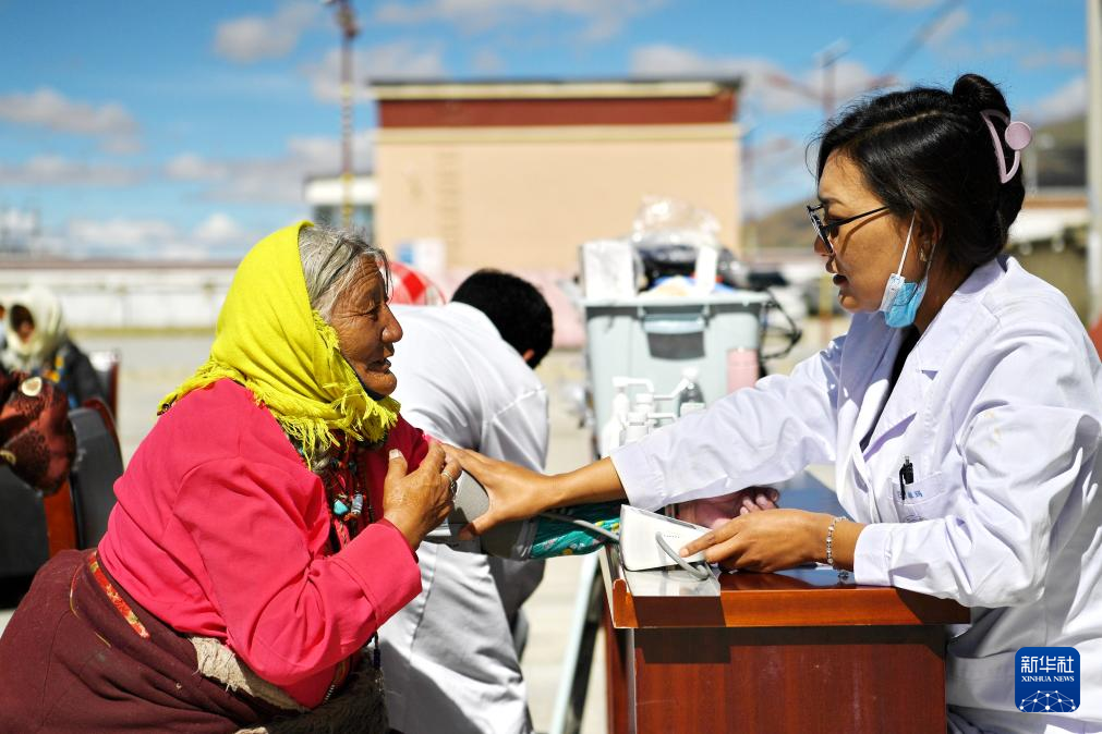 8月18日,在阿里地區(qū)措勤縣曲洛鄉(xiāng),鄉(xiāng)衛(wèi)生院醫(yī)生巴桑卓瑪為一名老人測(cè)量血壓。新華社記者 張汝鋒 攝
