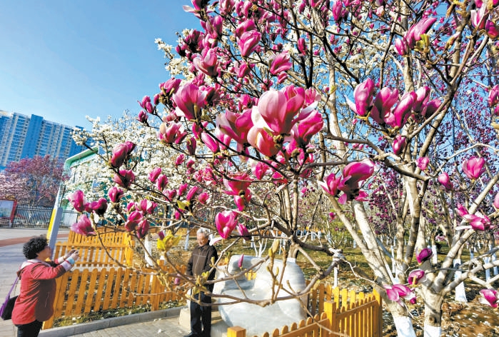 5日,許多市民來到北京國(guó)際雕塑公園踏青賞花,在盛開的玉蘭花前拍照留念。本報(bào)記者 吳鏑攝