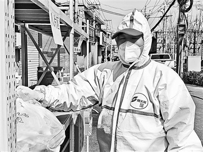 4月7日一早,在望京西園三區(qū)北門附近的管控區(qū)硬質(zhì)隔離圍欄內(nèi),小區(qū)物資配送小組工作人員正忙著將當日的居民物資、快遞等進行登記、分揀和消毒。隨后這些物資被分別送往每棟樓下的快遞架,再通知居民下樓自取。