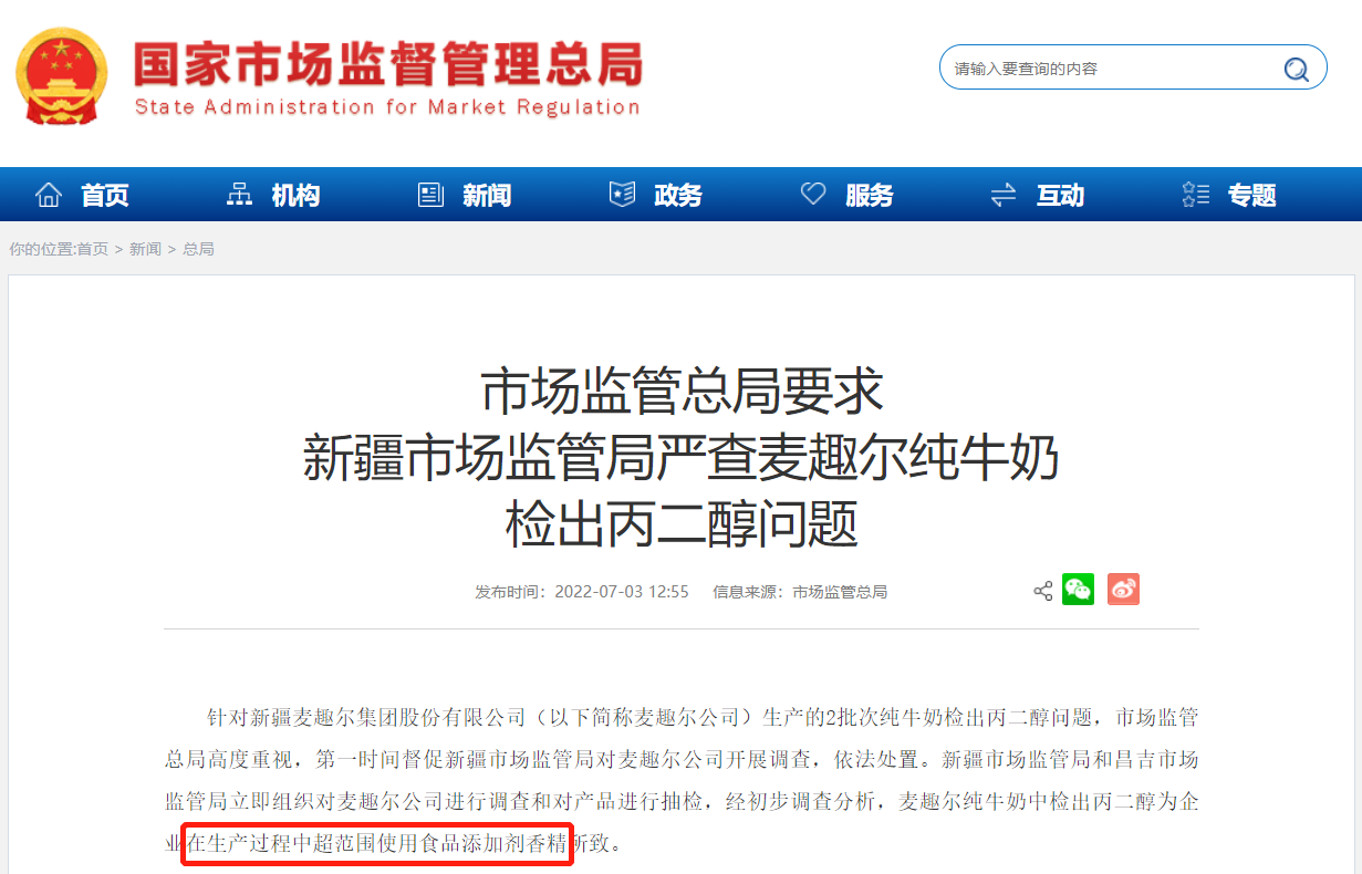 7月3日,國家市場監(jiān)管總局發(fā)布消息,要求“嚴查麥趣爾純牛奶檢出丙二醇問題”,并表示“經初步調查分析,麥趣爾純牛奶中檢出丙二醇為企業(yè)在生產過程中超范圍使用食品添加劑香精所致。”