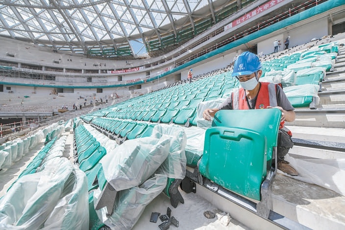 在新工體壯觀的鋼罩棚之下,一張張嶄新的“國槐綠”座椅被安裝到位。本報(bào)記者 潘之望攝