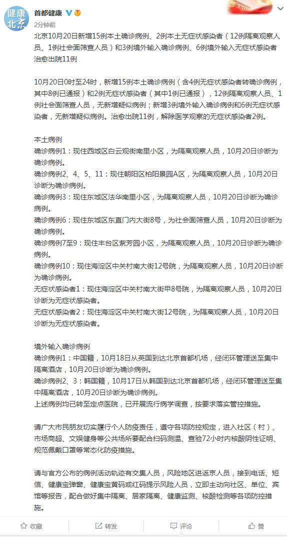 確診病例2、4、5、11:現(xiàn)住朝陽區(qū)柏陽景園A區(qū),為隔離觀察人員,10月20日診斷為確診病例。