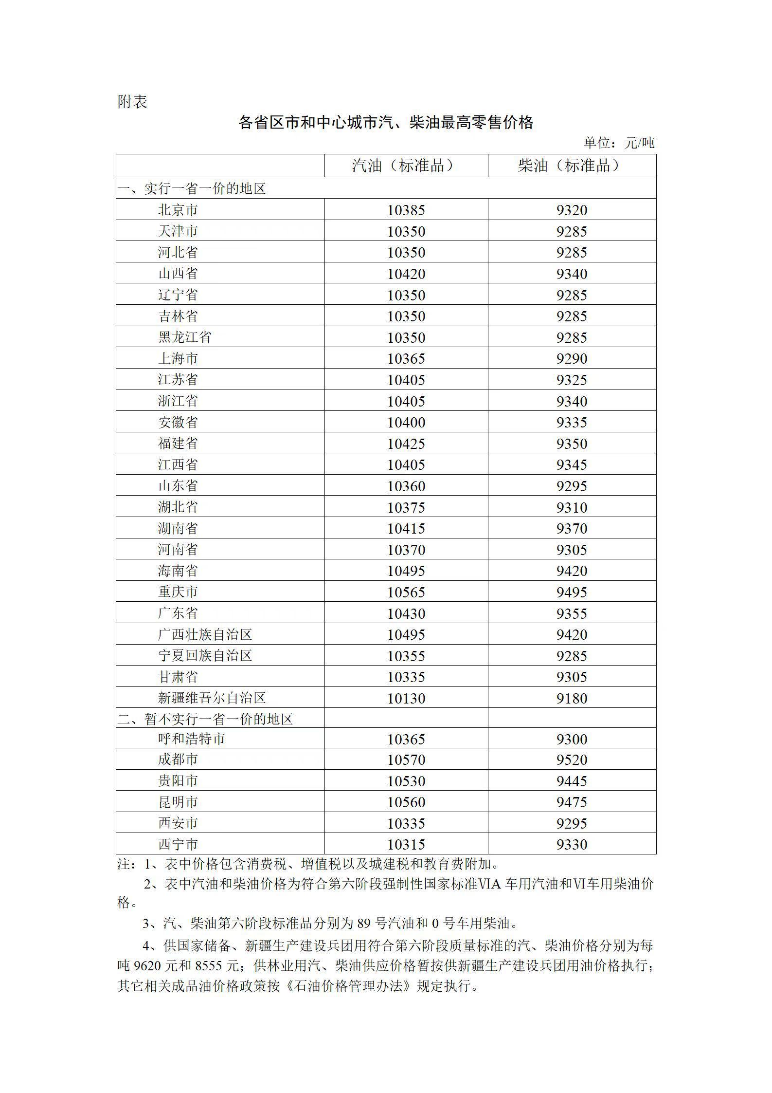 央廣網(wǎng)北京10月24日消息 據(jù)國家發(fā)展改革委官方網(wǎng)站消息,根據(jù)近期國際市場油價變化情況,按照現(xiàn)行成品油價格形成機制,自2022年10月24日24時起,國內(nèi)汽、柴油價格(標準品,下同)每噸分別提高185元和175元。調(diào)整后,各?。▍^(qū)、市)和中心城市汽、柴油最高零售價格見下表。相關價格聯(lián)動及補貼政策按現(xiàn)行規(guī)定執(zhí)行。