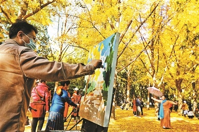 每年一進入11月,地壇公園內(nèi)的200余株銀杏樹就被“染成”金黃色,形成“紅墻金葉”這一獨特景觀,成為京城秋日中一抹靚麗的風景。11月1日上午,地壇公園內(nèi)“園林四季 秋之華彩”金秋銀杏活動吸引了不少青年藝術家、廣大藝術愛好者和游園群眾參與進來。陸愛民、李菲、賈見罡、李玉娥、王世高、徐佳、劉玉芬7位畫家相約而來,在地壇公園內(nèi)用手中的畫筆定格美景、描繪金秋。