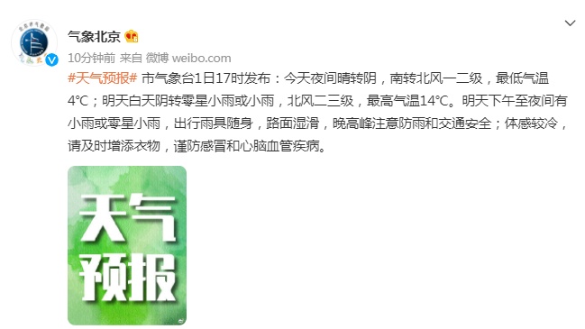 北京市氣象臺1日17時發(fā)布:今天(1日)夜間晴轉(zhuǎn)陰,南轉(zhuǎn)北風一二級,最低氣溫4℃;明天白天陰轉(zhuǎn)零星小雨或小雨,北風二三級,最高氣溫14℃。
