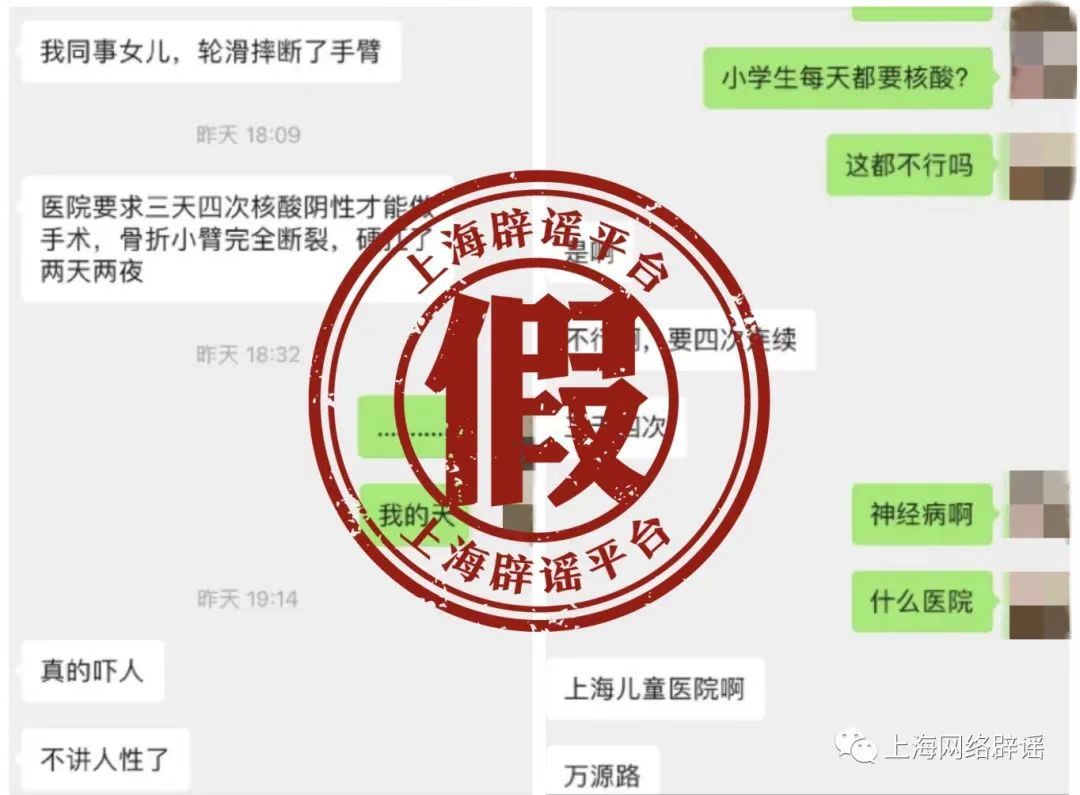 “上海一醫(yī)院要求兒童三天四次核酸才能做手術(shù),孩子骨折小臂斷裂,硬抗了兩天兩夜?!辈痪们?,一條聊天記錄在陸先生的家屬群引發(fā)熱議。因?yàn)楸斫阋患疑钤谏虾?,親戚還特意提醒她照顧好孩子。而很快,官方發(fā)布辟謠消息,稱經(jīng)過(guò)多路求證,聊天記錄中所指醫(yī)院并沒(méi)有三天四次核酸檢測(cè)陰性才能手術(shù)的要求,院方也未核查到存在所傳相似情況的病人。