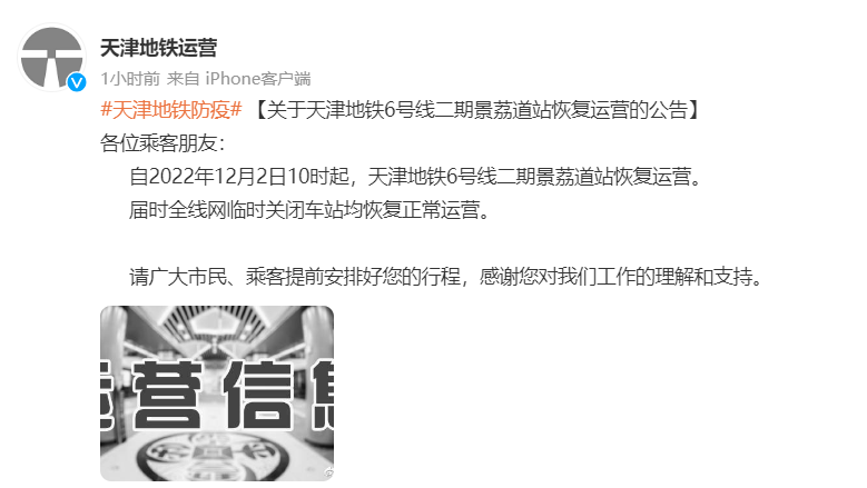 12月2日起天津地鐵全線網(wǎng)臨時(shí)關(guān)閉車站均恢復(fù)運(yùn)營