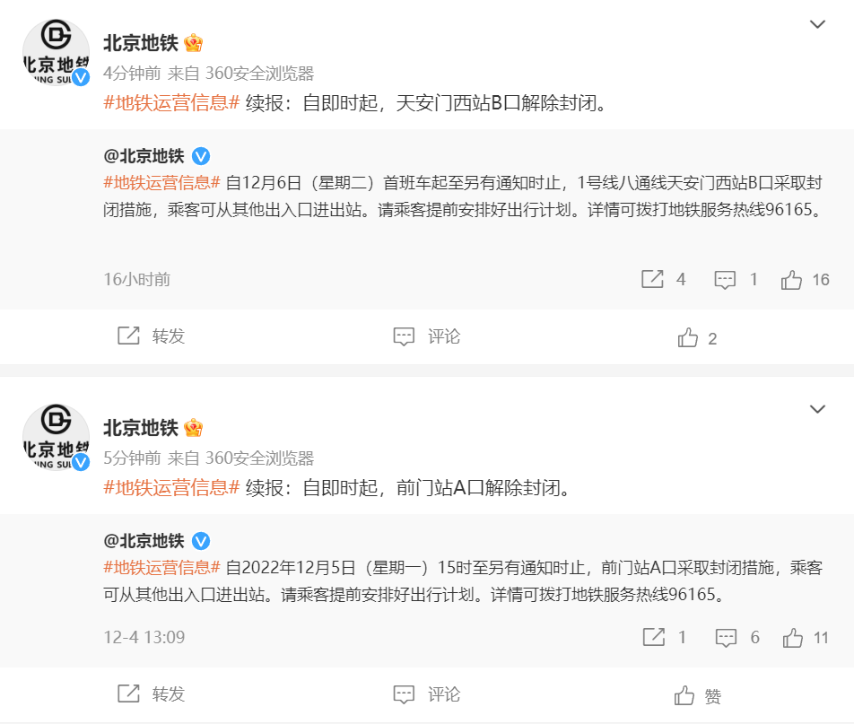 北京地鐵:1號(hào)線(xiàn)八通線(xiàn)前門(mén)站A口、天安門(mén)西站B口解除封閉