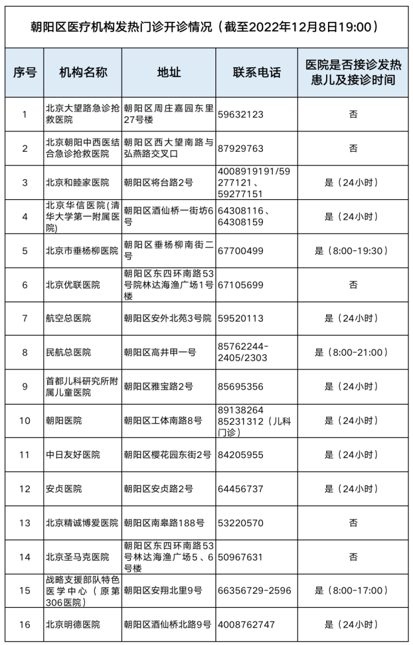 朝陽區(qū)16家發(fā)熱門診醫(yī)療機(jī)構(gòu)信息