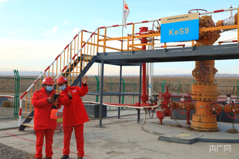 塔里木油田員工韓建偉和武恒正在克深9井巡檢(央廣網(wǎng)發(fā) 塔里木油田 供圖)