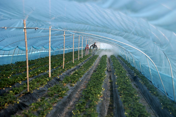 農(nóng)民在大棚內(nèi)給草莓噴施營(yíng)養(yǎng)液(央廣網(wǎng)發(fā) 顧繼紅 攝)