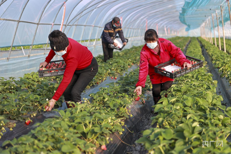 農(nóng)民在大棚內(nèi)采摘草莓(央廣網(wǎng)記者 王姝姝 攝)