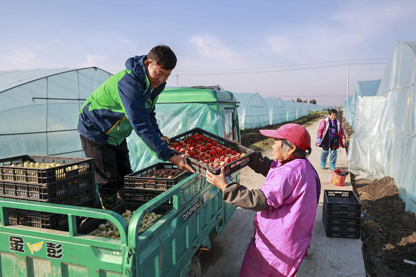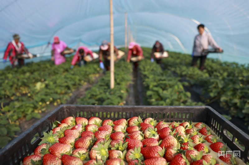 農(nóng)民在將剛采摘的紅草莓裝車(chē)(央廣網(wǎng)發(fā) 王安卿 攝)