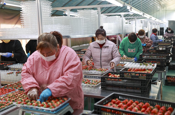 工人們?cè)诹魉€上分揀草莓(央廣網(wǎng)發(fā) 顧繼紅 攝)