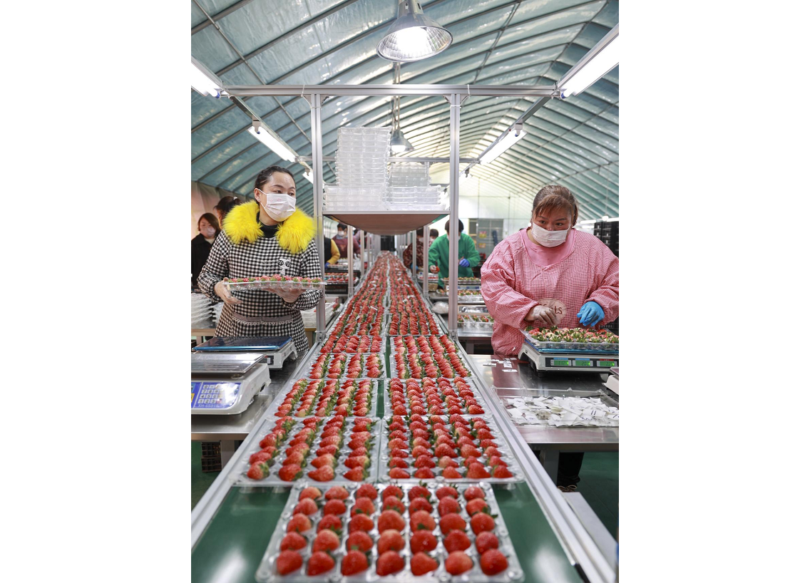 工人們?cè)诹魉€上分揀草莓(央廣網(wǎng)發(fā) 王安卿 攝)