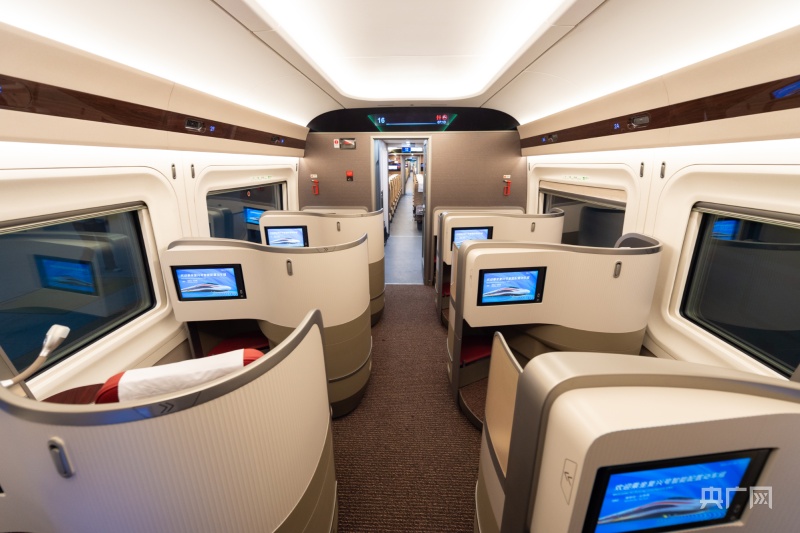 復(fù)興號(hào)智能型動(dòng)車(chē)組車(chē)廂里“科技感”、“時(shí)尚感”滿滿(央廣網(wǎng)發(fā) 廣鐵集團(tuán)供圖)