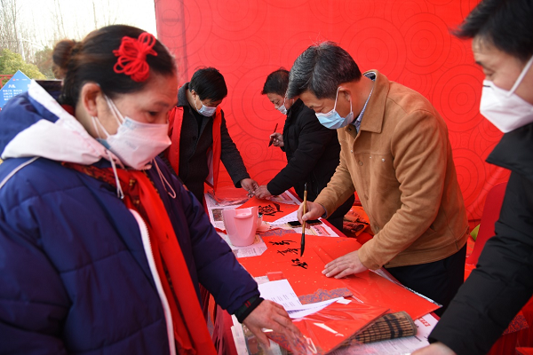 臺上歡歌載舞,臺下人頭攢動。配鑰匙、法律援助咨詢、醫(yī)生義診、眼鏡修理等服務(wù),吸引了不少村民。書法家們現(xiàn)場書寫幾百幅福字,將新年的美好祝愿贈予村民。