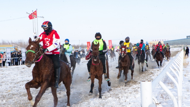“馬匹就位,預備……”隨著裁判一聲令下,騎手們駕馭的賽馬如離弦之箭,爭先恐后奔騰而過,雪地上馬蹄聲聲、雪花飛揚。參賽選手揮舞韁繩,策馬揚鞭,像一陣疾風掠過,盡情地在賽道上體驗著激情與速度。緊張刺激的比賽贏得觀眾的一片歡呼,大家紛紛拿出手機拍照,用鏡頭記錄下精彩的瞬間,現場歡呼聲、助威聲不絕于耳,把比賽氣氛推向了高潮。