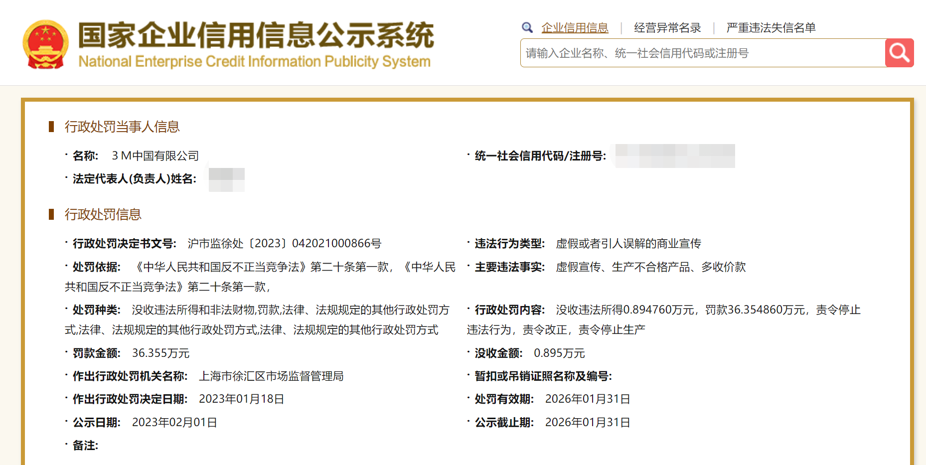 行政處罰信息顯示,3M中國主要違法事實為虛假宣傳、生產不合格產品、多收價款。