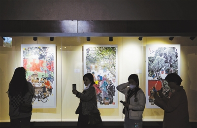 4月5日,游客在景山公園看《印象中軸 京城記憶——紫禁之巔系列馬海方書(shū)畫(huà)藝術(shù)展》。新京報(bào)記者 薛珺 攝