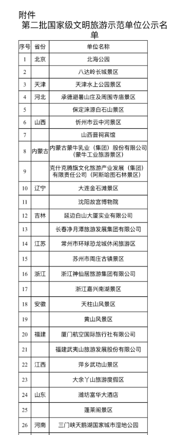 央廣網(wǎng)北京4月17日消息 據(jù)文化和旅游部網(wǎng)站消息,近日,全國旅游標(biāo)準(zhǔn)化技術(shù)委員會發(fā)布《關(guān)于第二批國家級文明旅游示范單位評定結(jié)果的公示》,經(jīng)自愿申報、省級文化和旅游行政部門審查推薦、全國旅游標(biāo)準(zhǔn)化技術(shù)委員會最終評定,認(rèn)定66家申報單位達(dá)到國家級文明旅游示范單位標(biāo)準(zhǔn),包括2021年因疫情原因未開展實地評定的9家單位和2022年申報的57家單位,現(xiàn)予以公示,公示期至2023年4月24日。