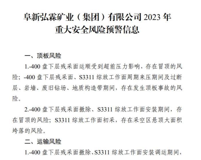 2023年1月,阜新市煤炭工業(yè)轉(zhuǎn)型發(fā)展局發(fā)布阜新市平安礦業(yè)有限責(zé)任公司和阜新弘霖礦業(yè)(集團(tuán))有限公司2023年重大安全風(fēng)險(xiǎn)預(yù)警信息。其中提及,阜新弘霖礦業(yè)(集團(tuán))有限公司涉及運(yùn)輸風(fēng)險(xiǎn)、火災(zāi)風(fēng)險(xiǎn)、瓦斯風(fēng)險(xiǎn)、爆炸風(fēng)險(xiǎn)等。(完)