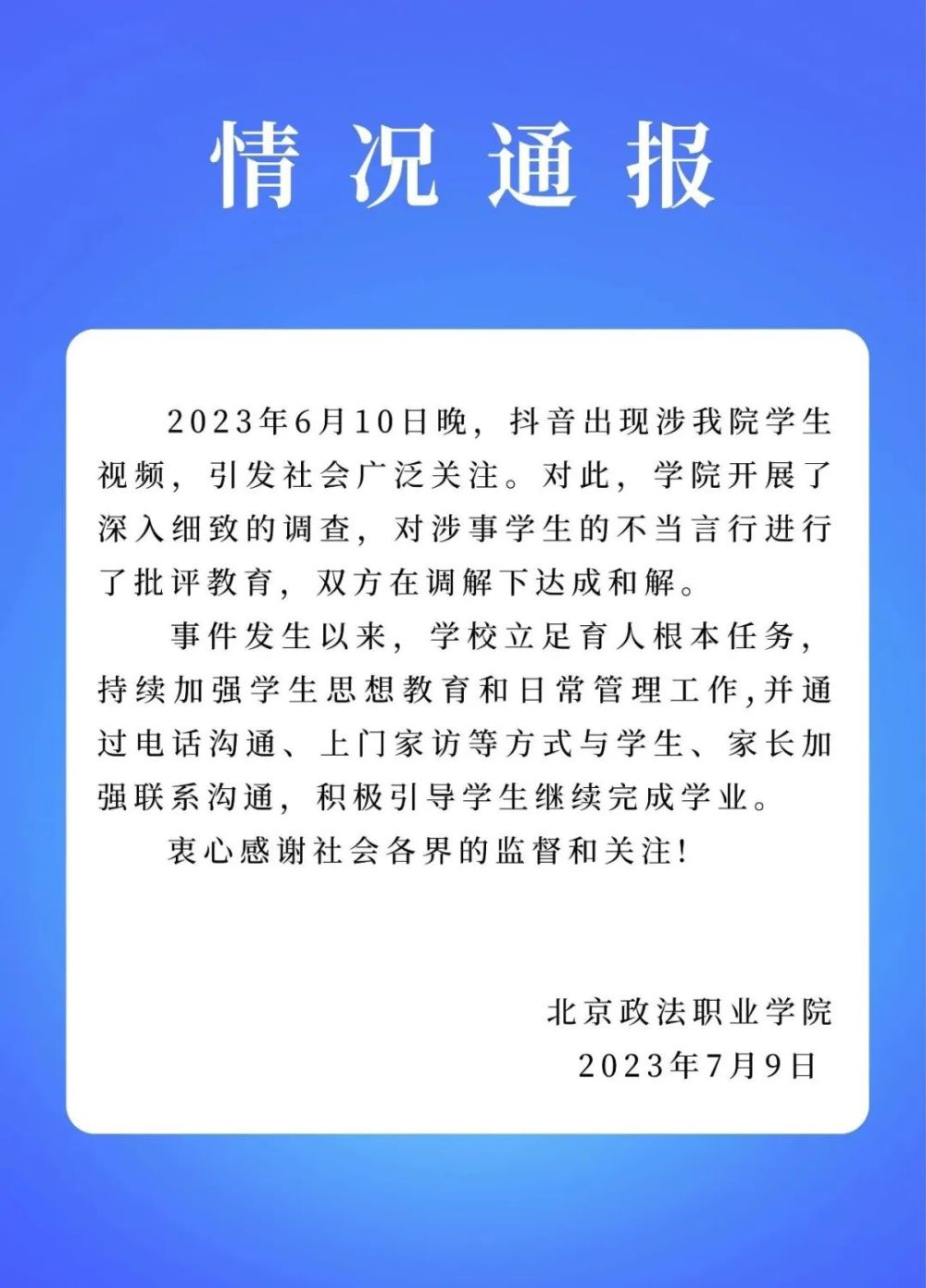 同時(shí),據(jù)北京政法職業(yè)學(xué)院,6月10日晚,抖音出現(xiàn)涉該院學(xué)生視頻,引發(fā)社會(huì)廣泛關(guān)注。對(duì)此,學(xué)院開展了深入細(xì)致的調(diào)查,對(duì)涉事學(xué)生的不當(dāng)言行進(jìn)行了批評(píng)教育,雙方在調(diào)解下達(dá)成和解。