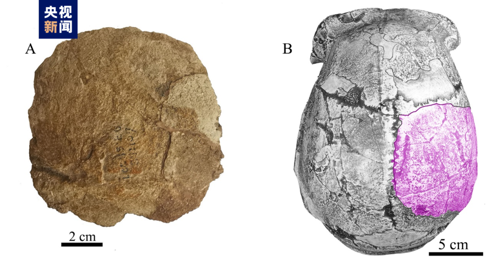 此次發(fā)現(xiàn)的標(biāo)本呈黃褐色,已完全石化,其骨壁厚度、曲度和尺寸,可與周口店直立人頭蓋骨的右側(cè)頂骨大致重疊。