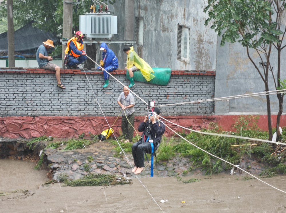 現(xiàn)場(chǎng),水已經(jīng)漫過被困人員所處的房屋屋頂,5名群眾被困在高處的墻頭,其中還有1名兒童。消防救援人員到場(chǎng)后,迅速利用繩索搭建救援通道。15分鐘后,繩橋架設(shè)完畢,消防救援人員對(duì)被困群眾展開救援。14時(shí)10分左右,救援任務(wù)成功完成,被困群眾均被轉(zhuǎn)移到安全地點(diǎn)。