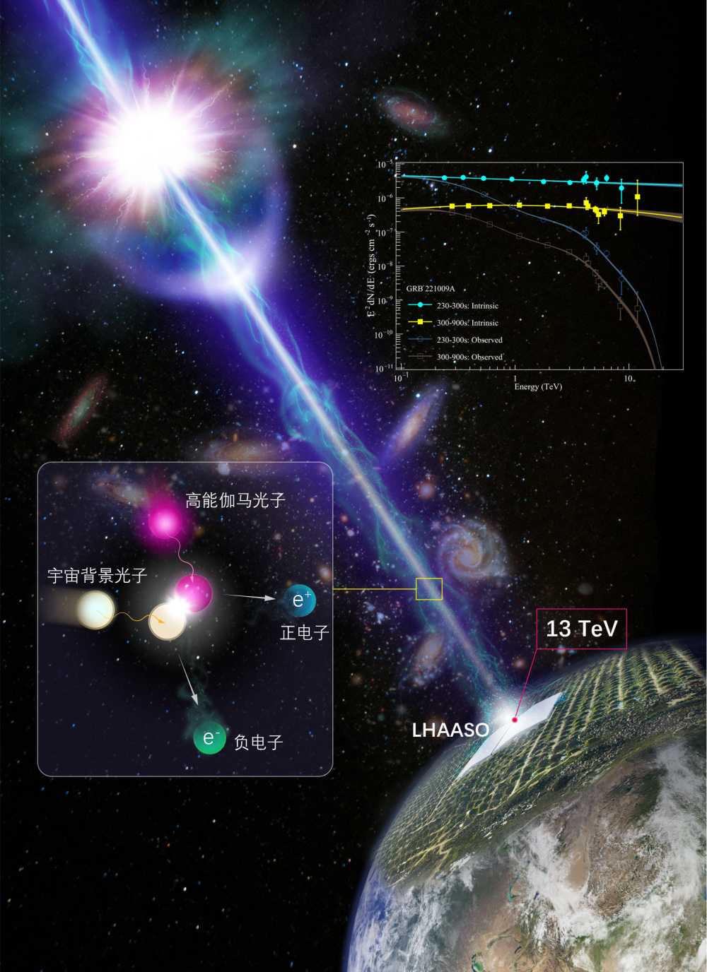 國(guó)家重大科技基礎(chǔ)設(shè)施“高海拔宇宙線觀測(cè)站(LHAASO)”(簡(jiǎn)稱“拉索”)正式發(fā)布了迄今最亮的伽馬射線暴(簡(jiǎn)稱“伽馬暴”,編號(hào)GRB 221009A)的高能伽馬輻射的精確能譜,該結(jié)果挑戰(zhàn)了傳統(tǒng)的伽馬暴余輝的標(biāo)準(zhǔn)輻射模型,揭示出宇宙背景光在紅外波段強(qiáng)度低于預(yù)期。同時(shí),該能譜為檢驗(yàn)愛(ài)因斯坦相對(duì)論的適用范圍、探索暗物質(zhì)候選粒子——軸子等新物理研究方面提供了重要信息。相關(guān)結(jié)果于北京時(shí)間11月16日在《科學(xué)進(jìn)展》(Science Advances)上發(fā)表,由中國(guó)科學(xué)院高能物理研究所牽頭的拉索國(guó)際合作組完成。