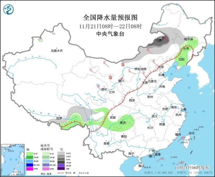 11月21日08時(shí)至22日08時(shí),內(nèi)蒙古東部、黑龍江西南部、吉林西部等地部分地區(qū)有小到中雪或雨夾雪,其中,內(nèi)蒙古東部局地有大到暴雪(10~12毫米)。吉林中部、遼寧大部、西藏東南部、四川盆地南部、重慶大部、貴州北部、云南東北部等地部分地區(qū)有小雨。西北地區(qū)中部和東北部、內(nèi)蒙古大部、華北西部和北部等地部分地區(qū)有4~6級(jí)風(fēng)。內(nèi)蒙古河套地區(qū)、甘肅河西等地局地有揚(yáng)沙(見圖6)。