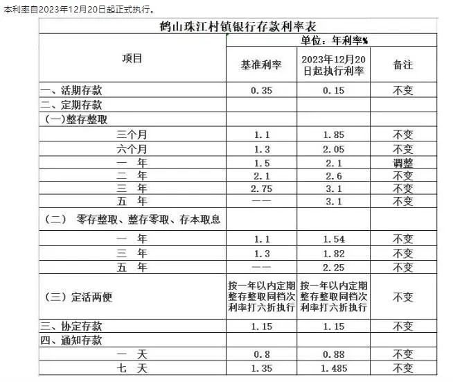 鶴山珠江村鎮(zhèn)銀行調(diào)整定期存款利率通告。截圖自鶴山珠江村鎮(zhèn)銀行微信公眾號