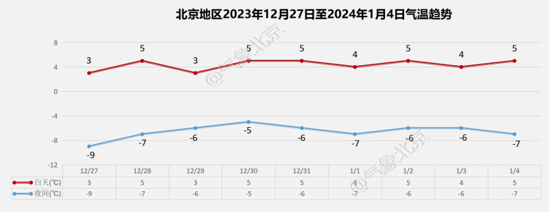 北京地區(qū)2023年12月27日至2024年1月4日氣溫趨勢(shì)。圖/北京市氣象臺(tái)