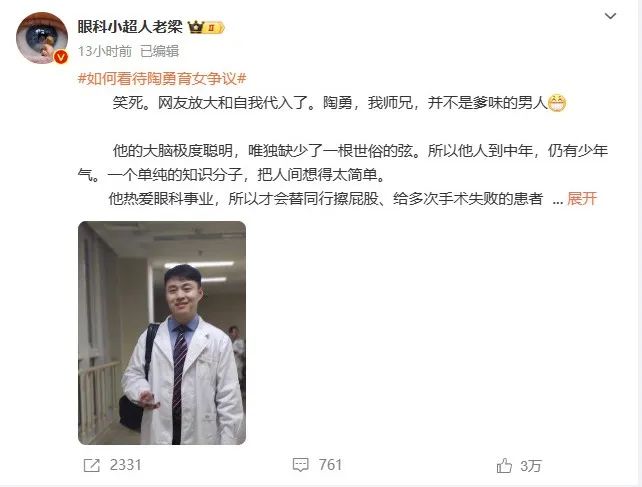 12月24日深夜,擁有超330萬粉絲的醫(yī)生大V“眼科小超人老梁”發(fā)長文力挺陶勇,稱他是自己的師兄,并不是爹味的男人。文中提到: